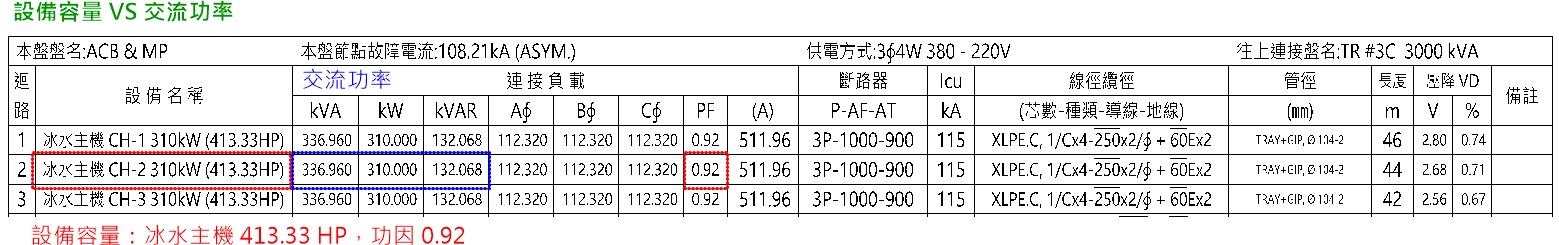將這些用電設備分成電燈(kVA),電力(HP)與電熱(kW)三類,然後計算容量加總,分別為 60.6 kVA,2430.59 HP與898 kW,假設1 HP≒1 kVA、1 kW≒1 kVA,設備總容量為 60.6 kVA + 2430.59 HP + 898 kW = 3389.19 kVA